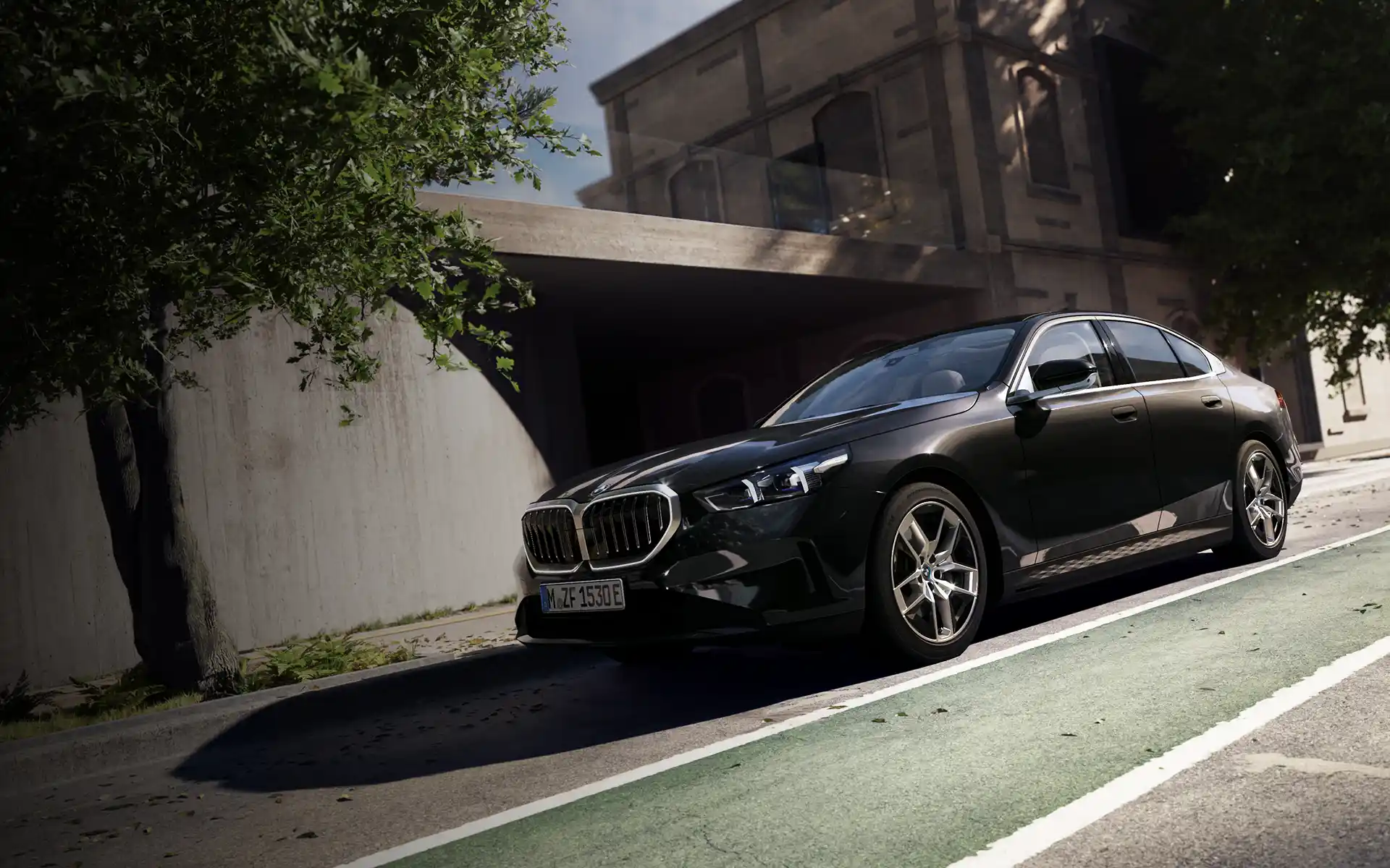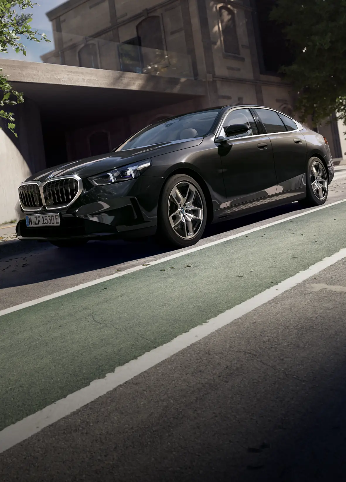 BMW 520i M Sport exudes a commanding presence, characterized by its iconic kidney grille, which is flanked by sleek, adaptive LED headlights. The aggressive front bumper, accented by the M Sport aerodynamic package, enhances the vehicle’s sporty and dynamic look.